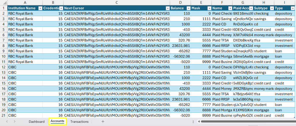 The Accounts sheet provides an overview of all your connected bank accounts.