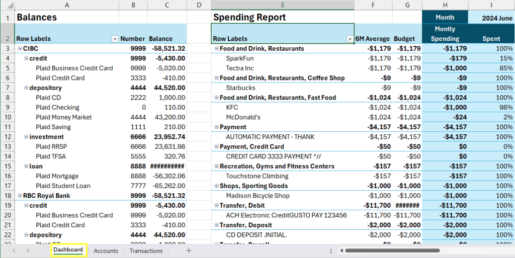 The Dashboard sheet provides a summary view of your financial data using pivot tables.